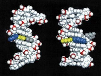 Keywords: DNA damaged by carcinogenic 2-aminofluorene AF.jpg Structures of DNA damaged by the carcinogenic aromatic amine 2-aminofluorene AF Left AF in the B-DNA major groove the predominant structure at a mutational coldspot Right AF inserted into the helix with displacement of the damaged guanine the predominant structure at a mutational hotspot Color code AF blue; AF-damaged guanine yellow; cytosine partner to damaged guanine gray Molecular Understanding of Mutagenicity Brian E Hingerty Oak Ridge National Laboratory Suse Broyde New York University Dinshaw J Patel Memorial Sloan Kettering Cancer Center Research Objectives To elucidate why certain DNA base sequences are mutational hotspots when damaged by carcinogenic environmental chemicals Computational Approach Molecular mechanics calculations in combination with data from NMR experiments in the form of distances between hydrogens on the carcinogen-damaged DNA molecule are employed to produce molecular views of the damaged DNA that are in agreement with the data The computations are carried out with the molecular mechanics program DUPLEX on the Cray C90 Accomplishments The aromatic amines are a category of environmental carcinogens present in tobacco smoke automobile exhaust dyes and other industrial products and broiled meats and fish These substances when activated biochemically can bind to DNA and subsequently cause a mutation when the DNA replicates Such mutations are widely believed to be the initiating event in carcinogenesis by these substances Often the target base in the DNA to which the carcinogen binds is guanine G Interestingly it has been found that a carcinogen-bound guanine may be highly mutagenic a hotspot or weakly or non-mutagenic depending on what the neighbor bases are One example of such a sequence that has been of considerable interest comes from the E coli bacterium It is known as the NarI sequence and contains the bases G1-G2-C-G3 where C is the base cytosine Surprisingly G3 is a mutational hotspot when bound by certain aromatic amine carcinogens while G1 and G2 are not The underlying reason for this difference has been a mystery and is of great importance because it is a paradigm for mutational hotspots such as in the p53 gene which are found mutated in many human tumors We have elucidated the structure of a DNA duplex containing the NarI sequence linked at G1 G2 or G3 with a model aromatic amine carcinogen known as 2-aminofluorene AF using a combination of high-resolution NMR solution studies and molecular mechanics computations These studies have revealed a striking difference in structure when the carcinogen damage is at G3 compared to G1 or G2 When the AF is at G1 or G2 it resides preponderantly in the major groove of an unperturbed B-DNA double helix However when the AF is at G3 it resides half the time in a position where it is inserted into the helix causing the damaged guanine to be displaced from its normal helix-inserted position It is plausible that this structural distortion if also present during DNA replication in the cell could be responsible for the failure of the DNA to replicate normally when the hotspot is damaged leading to the mutatagenic consequence Significance This work is the first delineation of structural distinctions between mutagenic hotspots and coldspots revealing how subtle differences in base sequence can produce remarkable differences in structure that can explain the hotspot phenomenon Publications Mao B Gu Z Hingerty B E Broyde S and Patel D J N d Solution structure of the aminofluorene AF-intercalated conformer of the syn AF-C8-dG adduct opposite dC in a DNA duplex Biochemistry In Press Mao B Gu Z Hingerty B E Broyde S and Patel D J N d Solution structure of the aminofluorene AF-external conformer of the anti AF-C8-dG adduct opposite dC in a DNA duplex Biochemistry In Press http //www nersc gov/news/annual_reports/annrep97/broyde jpg Brian E Hingerty Oak Ridge National Laboratory Suse Broyde New York University Dinshaw J Patel Memorial Sloan Kettering Cancer Center PD-USGov DNA intercalation |