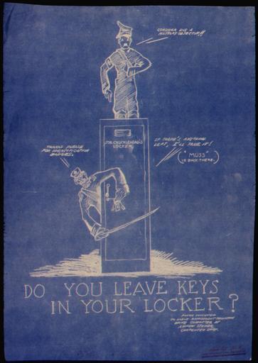 | Keywords: Do you leave keys in your locker^ - NARA - 535392.jpg Scope and content General notes 535392 Local identifier 179-WP-1542 Office for Emergency Management War Production Board 01/1942 - 11/03/1945 Still Picture Records Section Special Media Archives Services Division NWCS-S National Archives at College Park 8601 Adelphi Road College Park MD 20740-6001 other date circa 1942 1943 Record group Record Group 179 Records of the War Production Board 1918 - 1947 Record group ARC 508 War Production Board compiled 1942 - 1943 Series ARC 533858 File unit File unit ARC Variant control numbers NAIL Control Number NWDNS-179-WP-1542 Other versions <gallery> File Do_you_leave_keys_in_your_locker _-_NARA_-_535392 tif tif File Do_you_leave_keys_in_your_locker _-_NARA_-_535392 jpg jpg </gallery> NARA-cooperation PD-USGov World War II posters from the United States |