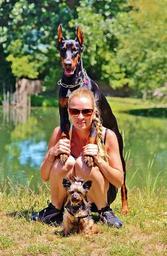 Keywords: doberman pinscher yorkshire terrier woman pets dogs love excursion friend nature