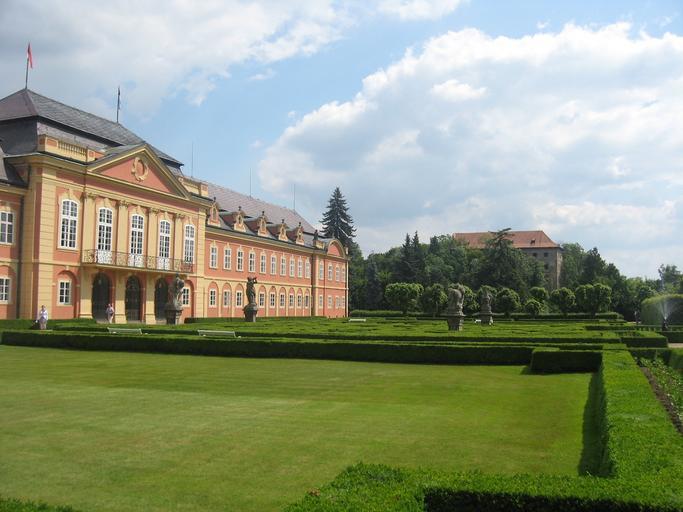 Keywords: dobris czech republic landscape palace building landmark historical sky clouds scenic hedges plants grass trees statues monuments sculptures nature outside architecture lawn grounds estate summer spring