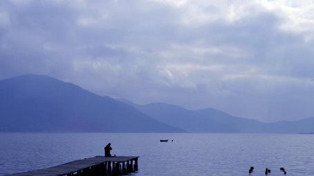 Keywords: dock lake water blue mountains sky clouds