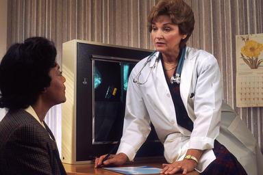 Keywords: Doctor consults with patient (8).jpg A Caucasian female doctor sitting on her desk with mammograms on a view box behind her speaks with an African-American female patient Topics/Categories People -- Adult People -- Health Professional and Patient Type Color Photo Source National Cancer Institute Bill Branson Photographer 2530 1990-11 Reuse Restrictions None - This image is in the public domain and can be freely reused Please credit the source and/or author listed above Bill Branson Photographer PD-USGov-HHS-NIH Media from National Cancer Institute Visuals Online Images uploaded by Fæ |