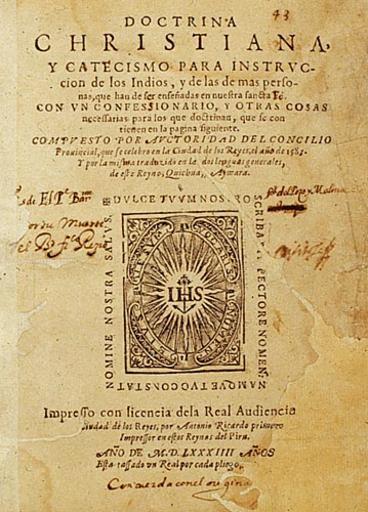 | Keywords: Doctrina Christiana.jpg en Title page of the Doctrina christiana y catecismo para instruccion de los Indios the first book printed in South America in Lima 1585 by Antonio Ricardo 2011-06-21 http //www library upenn edu/exhibits/rbm/kislak/religion/lima1 html Anonymous printed by Antonio Ricardo PD-old-100 Uploaded with UploadWizard Title pages Early printed books Antonio Ricardo 1585 books Books from Peru Quechuan languages Aymara | ||||