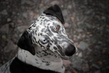 Keywords: dog animal eyes different color blue eye brown eye blue and brown looking spots white black fur dalmatian