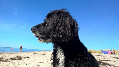 Keywords: dog dog on beach blue sky beach most beach fun