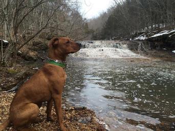 Keywords: dog hiking boxer pittbull hike nature waterfall sitting winter fall friend landscape trekking puppy walking escape tranquil peace