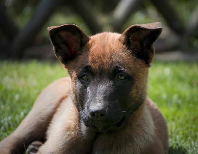 Keywords: dog puppy cute belgian shepherd animal garden mammal outdoors brown lying grass