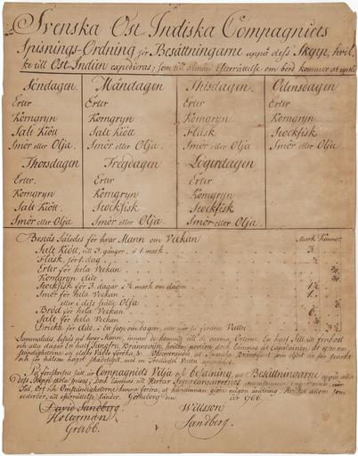 Keywords: Dokument spisordning - Sjöhistoriska museet - SH 522.jpg sv Spisningsordning matsedel gällande för ostindiska kompaniets fartyg 1766 sv 1766 paper indian ink Sjöhistoriska museet Stockholm object history sv Matsedel för ostindiefarare från 1766 Veckans matsedel var bestämd i förväg På tisdagar fick besättningen exempelvis ärtor korngryn fläsk samt smör eller olja När vädret var dåligt fick de en större ranson brännvin än vanligt Text från Sjöhistoriskas utställning Shipping Shopping 2010 Spisordning för Ostindiska Kompaniet 1766 En spisordning är en lista över mat som manskapet ska få ombord Den här spisordningen användes på svenska ostindiefarare på 1760-talet Det var ärter och korngryn samt lite salt kött eller stockfisk varje dag Till det bröd och ett stop dricka öl om dagen I ett inventarium från samma år för kompaniskeppet Lovisa Ulrika nämns dessutom socker grönsaker frukt rött vin och levande kreatur - mat framförallt avsedd för befälet Text ur Sjöhistoriskas årsbok 100 TING 2010-2011 Spisordningen visar matsedeln för en vecka som gällde för alla kompaniets fartyg Varje dag serverades ärtor korngryn smör eller olja Till detta tillkom söndag måndag och torsdag torkat kött tisdagar fläsk och onsdag fredag och lördag stockfisk Sammanledes bestås på hvar Mann innan de komma till de varma Orterne En half Sill till frukost och alla dagar En half Jungfru Brännevijn hvilken portion dock lämnas åt Capitainen at efter omständigheterne uti elakt Väder föröka Observerandes at Spanska Bränvijnet som eljest är för starkt och för hälsan högst skadeligt med en Trediedel Vattn upspädes exhibition history credit line accession number http //digitaltmuseum se/011024831133 SH 522 place of creation Institution Sjöhistoriska museet SMM cooperation project PD-old-70-1923 Sjöhistoriska museet Images from Sjöhistoriska museet Swedish East India Company Documents |