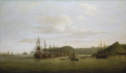 Keywords: Dominic Serres - Barrington's action at St Lucia 1778.jpg Artwork creator Dominic Serres LangSwitch This shows Admiral Samuel Barrington's squadron at anchor across the Grand Cul de Sac on the west side of St Lucia covering his invasion transports within it on the day following his successful defence of the anchorage during the American War against the French West Indies fleet This is seen in the far left distance as is the conical Pigeon Island off Gros Islet Bay further north The picture is the pair to BHC0422 which shows the action of the 15 December and both were exhibited at the Royal Academy in 1780 this one as 'View of the English squadron commanded by Admiral Barrington and transports in the Cul de Sac with the French fleet under Count d'Estaing December 16th 1778' Barrington's flagship 'Prince of Wales' 74 guns is last in the line in stern view on the left and he is shown with other figures standing on the stern gallery of his great cabin Ahead of him lie Commodore William Hotham's 'Preston' and the 'Centurion' both 50 guns the 'Nonsuch' 64 the 'Boyne' 70 the 'St Albans' 64 and the 'Isis' 50 The frigates present several of which are included were the 'Venus' 36 'Pearl' 32 and the 'Aurora' 28 with the smaller 'Ariadne' 20 and the 'Carcass' bomb vessel The single-masted vessel in the foreground appears to be carrying fascines bundles of timber used in siege works A Union flag hanging in Barrington's mizzen rigging is a signal for officers to come on board for a council of war and boats are crossing to him from other ships or waiting under his stern In 1824 after Barrington's death the pair of pictures was presented to the Naval Gallery in the Painted Hall at Greenwich Hospital together with BHC0370 and its pair and BHC0390 and its pair these also by Serres are smaller pictures of two of Barrington's earlier actions and the donor of all was his brother Shute Barrington Lord Bishop of Durham In 1831 William 3rd Viscount Barrington nephew of both the admiral and bishop wrote a letter to the Hospital in which he 'expressed an earnest desire that such of the Pictures as are in duplicate which were presented to the Hospital by his late Uncle the Bishop of Durham may be restored to him as the representative of the Family ' 1780 oil canvas cm 107 183 7 National Maritime Museum object history exhibition history Exhibited at the Royal Academy summer exhibition 1780 View of the English squadron commanded by Admiral Barrington and transports in the Cul de Sac with the French fleet under Count d'Estaing December 16th 1778 credit line National Maritime Museum Greenwich London Acquired with the assistance of The Art Fund and the Heritage Lottery Fund accession number ZBA2204 http //collections nmm ac uk/collections/objects/242166 html collections nmm ac uk PD-old-100 Dominic Serres Paintings in the National Maritime Museum London Sailing ships of the Royal Navy 18th-century sailing ships in paintings Military under Louis XVI of France 1774-1792 |
