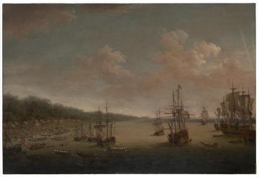 Keywords: Dominic Serres the Elder - The Capture of Havana, 1762- the Landing, 7th June.jpg A depiction of an episode from the last major operation of the Seven Years War 1756 “63 It was part of England ™s offensive against Spain when she entered the war in support of France late in 1761 The British Government ™s response was immediately to plan large offensive amphibious operations against Spanish overseas possessions particularly Havana the capital of the western dominions and Manila the capital of the eastern Havana needed large forces for its capture and early in 1762 ships and troops were dispatched under Admiral Sir George Pocock and General the Earl of Albemarle The force which descended on Cuba consisted of 22 ships of the line four 50-gun ships three 40-gunners a dozen frigates and a dozen sloops and bomb vessels In addition there were troopships storeships and hospital ships Pocock took this great fleet of about 180 sail through the dangerous Old Bahama Strait from Jamaica to take Havana by surprise Havana on Cuba's north coast was guarded by the elevated Morro Castle which commanded both the entrance to its fine harbour immediately to the west and the town on the west side of the bay This painting shows the encampment of the British troops at Cojimar Bay after landing some six miles east of Morro Castle on 7 June in preparation for the siege To the left are the rows of tents of the British camp with boats moving to and fro between storeships and elements of Pocock's fleet flying blue on the right between 1770 75 Oil canvas cm 127 6 188 6 Institution National Maritime Museum object history credit line On loan to the National Maritime Museum Greenwich London from a private lender accession number BHC0409 http //collections rmg co uk/collections/objects/11901 html Royal Museums Greewich PD-old-100 Dominic Serres Paintings of Battle of Havana Cuba in the 1760s 18th-century paintings of naval battles Paintings in the National Maritime Museum London |