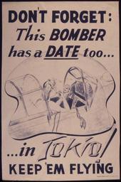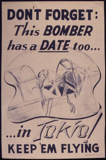 | Keywords: DON'T FORGET, This BOMBER has a DATE too... in TOKYO^ KEEP `EM FLYING - NARA - 534734.jpg Scope and content General notes 534734 Local identifier 179-WP-883 Office for Emergency Management War Production Board 01/1942 - 11/03/1945 Still Picture Records Section Special Media Archives Services Division NWCS-S National Archives at College Park 8601 Adelphi Road College Park MD 20740-6001 other date circa 1942 1943 Record group Record Group 179 Records of the War Production Board 1918 - 1947 Record group ARC 508 War Production Board compiled 1942 - 1943 Series ARC 533858 File unit File unit ARC Variant control numbers NAIL Control Number NWDNS-179-WP-883 Other versions <gallery> File DON'T_FORGET _This_BOMBER_has_a_DATE_too _in_TOKYO _KEEP_`EM_FLYING_-_NARA_-_534734 tif tif File DON'T_FORGET _This_BOMBER_has_a_DATE_too _in_TOKYO _KEEP_`EM_FLYING_-_NARA_-_534734 jpg jpg </gallery> NARA-cooperation PD-USGov World War II posters from the United States |