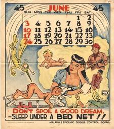 | Keywords: Don’t spoil a good dream sleep under a bed net..JPG en A naked man is shown sleeping on a cot In a dream bubble above his head are images of a beautiful woman a naked baby a man carrying a rifle a man swing a golf club and an obedient dog In reality outside the dream bubble an oversized mosquito is about to bite the posterior of the sleeping man 2013-09-25 17 05 17 Courtesy of the National Library of Medicine Images from the History of Medicine IHM http //ihm nlm nih gov/images/C06236 Also showcased in the book Hidden Treasure New York NY Blast Books 2012 p 172 HMD Prints Photos call number PP059709 cab Washington D C U S Army 1945 Custom license marker 2013 09 25 PD-USGov Uploaded with UploadWizard World War II anti-malaria posters from the United States Dreaming Mosquitos in art 20th-century cartoons Mosquito nets |