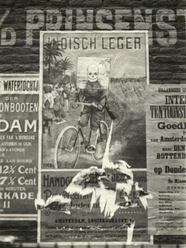 | Keywords: militairen koninklijk nederlands-indisch nederlandsindisch leger biljet poster indisch leger indischleger protest anti-militarism antimilitarism text outdoor monochrome Spaarnestad Photo/SFA022800554 Aanplakbiljet waarin deelname aan het K.N.I.L. wordt gepropageerd, met daaroverheen een doodskop geplakt als protest tegen het leger. Nederland, Amsterdam, 1912. Spaarnestad Photo/SFA022800554 Aanplakbiljet waarin deelname aan het K.N.I.L. wordt gepropageerd, met daaroverheen een doodskop geplakt als protest tegen het leger. Nederland, Amsterdam, 1912. |