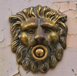 Keywords: door bell door clamp bell clamp push button presser door knob door opener button antique old metal bronze brass lion lion head animal dingdong foot snapdragon hauswand plaster ailing crumbled off flaked off patina shiny