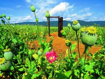 Keywords: door field away landscape nature meadow clouds sky fields lane summer poppy encapsulate poppy capsule