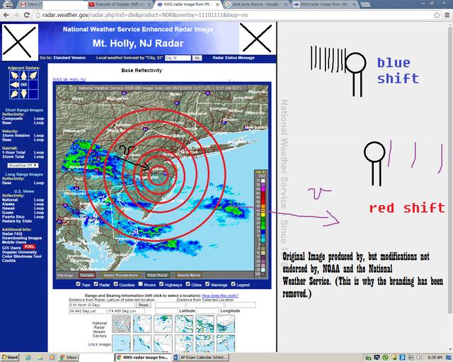 | Keywords: The Doppler effect is most useful to us when it is used with light waves instead of sound waves. You learned in the electricity/magnetism unit that in the visible spectrum, light waves with the lowest frequencies are perceived as red colored, and visible light waves with the highest frequencies are perceived as blue/violet. Doppler radar works by emitting light waves at microwave frequencies and looking for changes in the apparent frequency of light of the waves as they bounce off the weather phenomenon and come back. If there's a blue shift (in other words, an apparent higher frequency coming back) then the storm is approaching the radar, and if there's a red shift (a lower frequency than what was sent out,) the storm is moving away. Weather radar design is really complicated, and the above is an over simplification- see here for more details. en.wikipedia.org/wiki/Weather_radar The National Weather Service maintains a nationwide network of weather radars, which has saved many lives over the years. Here are some radars that are of relevance for my students: TLX Radar, located in Central Oklahoma between Draper Lake and Lake Thunderbird (TLX stands for Twin Lakes) radar.weather.gov/radar.php?rid=TLX OKX Radar, located at Brookhaven National Labs on Long Island, is the NWS radar for Connecticut radar.weather.gov/radar.php?rid=OKX The Doppler effect is also essential to understanding how modern astronomy works. By looking at the spectra from distant stars, we can tell what element they're made of (we'll discuss this in the light unit.) But sometimes, the fingerprint of a certain element appears to have shifted to higher than expected frequencies (blue shift) or lower than expected frequencies (red shift.) This tells us whether that star or galaxy is moving towards us or away from us, and is what convinced us that the universe is expanding. The Doppler effect is most useful to us when it is used with light waves instead of sound waves. You learned in the electricity/magnetism unit that in the visible spectrum, light waves with the lowest frequencies are perceived as red colored, and visible light waves with the highest frequencies are perceived as blue/violet. Doppler radar works by emitting light waves at microwave frequencies and looking for changes in the apparent frequency of light of the waves as they bounce off the weather phenomenon and come back. If there's a blue shift (in other words, an apparent higher frequency coming back) then the storm is approaching the radar, and if there's a red shift (a lower frequency than what was sent out,) the storm is moving away. Weather radar design is really complicated, and the above is an over simplification- see here for more details. en.wikipedia.org/wiki/Weather_radar The National Weather Service maintains a nationwide network of weather radars, which has saved many lives over the years. Here are some radars that are of relevance for my students: TLX Radar, located in Central Oklahoma between Draper Lake and Lake Thunderbird (TLX stands for Twin Lakes) radar.weather.gov/radar.php?rid=TLX OKX Radar, located at Brookhaven National Labs on Long Island, is the NWS radar for Connecticut radar.weather.gov/radar.php?rid=OKX The Doppler effect is also essential to understanding how modern astronomy works. By looking at the spectra from distant stars, we can tell what element they're made of (we'll discuss this in the light unit.) But sometimes, the fingerprint of a certain element appears to have shifted to higher than expected frequencies (blue shift) or lower than expected frequencies (red shift.) This tells us whether that star or galaxy is moving towards us or away from us, and is what convinced us that the universe is expanding. |