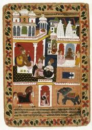 | Keywords: Double-sided Leaf from a Chandana Malayaqiri Varta Series Ascribed to the artists Karam and Mahata Chandji.jpg Whereas most manuscript paintings made in Rajasthan in the eighteenth century were commissioned by Hindu rulers this painting was made for a practitioner of the Jain religion probably a wealthy merchant The image illustrates a Jain text though the precise subject is difficult to identify and includes a small shrine with an icon of a Jain savior known as a Jina or Tirthankara on the right The icon sits cross-legged in a meditative posture and the temple has two white towers of the classic North Indian form In a nice detail a small pool in front of the temple reflects the surrounding architecture 1745 Opaque watercolor and gold on paper Overall 11 3/8 x 7 7/8 in 28 9 x 20 0 cm Institution Brooklyn Museum object history credit line Gift of Mr and Mrs Paul E Manheim accession number 69 125 5 http //www brooklynmuseum org/opencollection/labs/splitsecond/painting php id 54 Chandana Malayaqiri Varta Series PD-old-100 Uploaded with UploadWizard 18th-century Mughal miniatures 18th-century paintings from India in the Brooklyn Museum 1745 watercolor paintings 1740s paintings from India Jain art in India Illuminated manuscripts created in India Jain manuscripts |