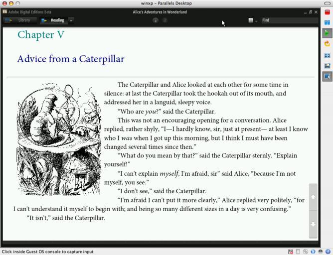Keywords: alice in wonderland aliceinwonderland ebook winxp adobe digital editions digitaleditions outdoor XHTML eBook rendered through Adobe's new "Digital Editions" beta ebook reader application (itself seemingly a Flash based application), running on Win XP which is running inside of Parallels, which is running on OS X. XHTML eBook rendered through Adobe's new "Digital Editions" beta ebook reader application (itself seemingly a Flash based application), running on Win XP which is running inside of Parallels, which is running on OS X. |