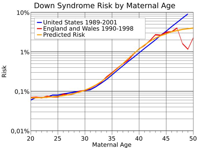 Keywords: Down Syndrome Risk by Maternal Age-semilog.svg translate yes en Down syndrome risk increases slightly with age up to 31 years old and more rapidly to age 40 increasing from about 0 1 to about 1 The variation of displayed risk between the United States the predicted risk and that observed in England and Wales is not statistically significant Data from England and Wales and the predicted risk are fromhttps //www ncbi nlm nih gov/pubmed/11943789 while the United States data is fromhttp //downsyndrome about com/od/diagnosingdownsyndrome/a/Matagechart htm Predicted risk 1/ 1+exp 7 330-4 211/ 1+exp -0 282x age-37 23 2014-08-22 own Delphi234 Data wikitable - Age United States<br>1989-2001 England and Wales<br>1990-1998 Predicted Risk - 15 1 2434 1 1513 - 16 1 2013 1 1509 - 17 1 1599 1 1504 - 18 1 1789 1 1497 - 19 1 1440 1 1488 - 20 1 1667 1 1441 1 1476 - 21 1 1429 1 1409 1 1461 - 22 1 1429 1 1465 1 1441 - 23 1 1429 1 1346 1 1415 - 24 1 1250 1 1396 1 1381 - 25 1 1250 1 1383 1 1339 - 26 1 1176 1 1187 1 1285 - 27 1 1111 1 1235 1 1219 - 28 1 1053 1 1147 1 1139 - 29 1 1000 1 1002 1 1045 - 30 1 952 1 959 1 937 - 31 1 909 1 837 1 819 - 32 1 769 1 702 1 695 - 33 1 625 1 589 1 571 - 34 1 500 1 430 1 455 - 35 1 385 1 338 1 352 - 36 1 294 1 259 1 266 - 37 1 227 1 201 1 199 - 38 1 175 1 162 1 148 - 39 1 137 1 113 1 111 - 40 1 106 1 84 1 85 - 41 1 82 1 69 1 67 - 42 1 64 1 52 1 54 - 43 1 50 1 37 1 45 - 44 1 38 1 38 1 39 - 45 1 30 1 32 1 35 - 46 1 23 1 31 1 31 - 47 1 18 1 25 1 29 - 48 1 14 1 62 1 27 - 49 1 11 1 86 1 26 - 50 1 44 1 25 cc-zero Uploaded with UploadWizard Down syndrome |