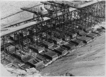 | Keywords: Downstream view of concrete blocks under construction on west side - NARA - 294297.tif Scope and content Photograph from Volume Two of a series of photo albums documenting the construction of the Grand Coulee Dam and related work on the Columbia Basin Project General notes 294297 Local identifier Department of the Interior Bureau of Reclamation Engineering and Research Center 05/18/1981 - 03/04/1988 NARA's Rocky Mountain Region Denver NRGA Building 48 Denver Federal Center West 6th Avenue and Kipling Street Denver CO 80225-0307 1936-03-31 Record group Record Group 115 Records of the Bureau of Reclamation 1889 - 2008 Record group ARC 444 Photograph albums compiled 1903 - 1972 Series ARC 293611 File unit File unit ARC Variant control numbers NAIL Control Number NRG-115-CONSTPHO85006-COLBASIN21025 yes Other versions <gallery> File Downstream view of concrete blocks under construction on west side - NARA - 294297 jpg jpg </gallery> NARA-cooperation PD-USGov Construction of the Grand Coulee Dam NARA TIF images with categorized JPGs |
