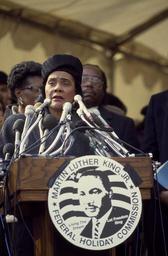 | Keywords: Dr. Martin Luther King, Jr.'s widow, Coretta Scott King, speaks at a 1988 event in which a time capsule holding some of Dr. King's possessions is lowered into the ground at Freedom Plaza on LCCN2011632686.tif 1 transparency color ; 4 x 5 in or smaller Notes Credit line Photographs in the Carol M Highsmith Archive Library of Congress Prints and Photographs Division ; Forms part of the Selects Series in the Carol M Highsmith Archive ; Gift and purchase; Carol M Highsmith; 2011; DLC/PP-2011 124 ; Title date and keywords provided by the photographer ; Photograph taken during the 1980s ; Digital image produced by Carol M Highsmith to represent her original film transparency; some details may differ between the film and the digital images 1988 Creator Carol M Highsmith Library of Congress Catalog http //lccn loc gov/2011632686 Image download https //cdn loc gov/master/pnp/highsm/17200/17272a tif Original url http //hdl loc gov/loc pnp/highsm 14492 No known restrictions on publication LOC-image highsm 14492 220px PD-Highsmith Images uploaded by Fæ Photographs by Carol M Highsmith |