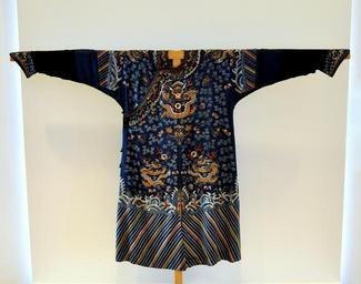 | Keywords: Drachengewand makffm 14629.jpg žDrachengewand eines kaiserlichen Beamten blaues Atlasgewebe bestickt mit Atlasstich Knötchenstich und Anlegetechnik in Seide žPferdehuf-Manschetten und Verschluss mit Brokatborte; China Qing-Zeit; spätes 19 Jh ; Museum für Angewandte Kunst Frankfurt am Main Inv Nr 14629 Schenkung Hermann Reich žDragon Robe of a Mandarin an imperial civil servant; China Qing Dynasty; late 19th century; Museum für Angewandte Kunst Frankfurt am Main Inv No 14629 donated by Hermann Reich own 2011-04 Photo User FA2010 Asian art in the Museum für Angewandte Kunst Frankfurt Clothing of the Qing Dynasty |