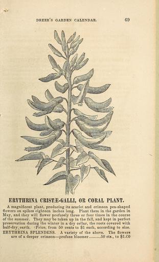 Keywords: Dreer's garden calendar 1868 (16410412976).jpg DREER S GARDEN CALENDAR <br> 69 <br> J <br> EEYTERINA CMSTJl-GALLI OE CORAL PLANT <br> A magnificent plant producing its scarlet and crimson pea- <br> flowers on spikes eighteen inches long Plant them in the garden in <br> May and they will flower profusely three or four times in the course <br> of the summer They may be taken up in the fall and kept in perfect <br> preservation during the winter in a dry cellar the roots covered with <br> half-dry earth Price from 50 cents to 1 each according to size <br> ERYTHRINA SPLENDENS A variety of the above The flowers <br> are of a deeper crimson ” profuse bloomer 50 cts to 1 C0 43808898 149128 77933 Page 69 Text http //www biodiversitylibrary org/page/43808898 1868 10 5962/bhl title 77933 Henry A Dreer Firm ; Henry G Gilbert Nursery and Seed Trade Catalog Collection NameFound EEYTERINA NameFound Erythrina splendens NameConfirmed Erythrina splendida Diels EOLID 644484 NameBankID 707734 Biodiversity Heritage Library Dreer's garden calendar 1868 Garden Stories Catalogs Flowers Gardening Henry A Dreer Firm Nursery stock Seeds U S Department of Agriculture National Agricultural Library bhl page 43808898 dc identifier http //biodiversitylibrary org/page/43808898 Coral plant bhlGardenStories Erythrina cristae-galli BHLinbloom henry a dreer firm u s department of agriculture national agricultural library bhlgardenstories bhlinbloom Information field Flickr posted date ISOdate 2015-02-03 Check categories 2015 August 24 CC-BY-2 0 BioDivLibrary https //flickr com/photos/61021753 N02/16410412976 2015-08-24 06 53 20 cc-by-2 0 PD-old-70-1923 Dreer's garden calendar 1868 Photos uploaded from Flickr by Fæ using a script |