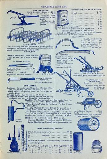 | Keywords: Dreer's wholesale price list autumn edition September to December 1900 (16257284948).jpg WHOLESALE PRICE LIST <br> THE GALE PLOW <br> 25 A ” Light 1-Horse <br> 5 00 <br> 7 50 <br> Complete with <br> Jointer and Wheel <br> 10 50 <br> The best plow for <br> private or market <br> gardens <br> PAINTED POT and TREE <br> LABELS <br> Per 1000 <br> 60 <br> 65 <br> 70 <br> 90 <br> 1 25 <br> 2 50 <br> 3 50 <br> 4 50 <br> 60 <br> 1 00 <br> KAIN HARROW <br> One of the very best tools for private or market gardens <br> The harrows are provided with runners so they can be easily <br> moved without tearing up walks or roads <br> 24-tooth 5 00 <br> CAHOON BROADCAST SEED SOWER <br> Will sow any kind of grain or grass <br> 3 25 <br> FLORISTS' KNIVES <br> 3J inch Notched or pierced tree <br> 3 Notched or pierced tree with copper wire <br> DREER'S INDELIBLE LABEL PENCIL <br> A black indelible pencil superior to any yet introduced <br> for florists' use 5 cts each ; 50 cts per dozen <br> GRASS HOOKS <br> English Eiveted back; <br> No 0 40c; No l 50c <br> No 2 60c; No 3 65c <br> American plain back 25c <br> Dutch steel two sizes <br> solid 30c and 40c <br> SCYTHES <br> English Lawn riveted <br> back 30 and 34 in <br> 1 00; 36 in 1 15; <br> 33 in 1 25 <br> American best of steel <br> 75c <br> American Brush 60c <br> English Budding each <br> American <br> Dreer's Special <br> English and American Pruning 75 to 1 50 <br> DREER'S EUREKA <br> WEEDER <br> 25c; 2 50 per dozen <br> SUNDRIES <br> Baskets For use in vegetable garden £ bu oak 50 cts ; <br> 1 bu oak 60 cts ; 1 bu oak iron-bound 75 cts <br> Jersey Peat For potting plants etc 1 25 per bbl ; <br> obbls 5 00 <br> Oregon Peat Only for orchids 10 cts per lb <br> Sphagnum Moss For growing orchids and packing <br> plants and trees etc 1 25 per bbl ; 2 00 per bale <br> Raphia The best material for tying plants vines etc <br> Per lb 18 cts ; 10 lbs 1 65 ; 100 lbs 15 00 <br> White Cotton Twine for Pot herbs Per lb 20 cts ; <br> 10 lbs 1 75 <br> Two-ply Coarse Cotton Twine for general use in <br> tying Beets Carrots etc 16 cts per lb ; 5 lbs 75 cts <br> Jute Twine for tying Plants or Vegetables 12 cts per <br> lb ; 100 lbs 11 00 Can be supplied in 2 3 and 4 ply <br> Silkaline for smilax and asparagus Spool 20c ; lb 1 25 <br> Mastica A substitute for putty 1 25 per gal <br> Mastica Machine For applying mastica 1 00 each <br> Putty Distributor For applying putty or mastica 75c <br> Wire Sieves ” Any size mesh <br> 20-inch diameter extra heavy 0 65 <br> 18 50 <br> 20 medium 45 <br> 18 40 <br> Iron Age Diamond Tooth Harrow <br> WithWheel 5 35 WithoutWheel 4 60 <br> PLANET JR No 8 <br> HORSE HOE <br> Price 810 00 <br> Without Depth regula- <br> tor order as <br> No 7 9 25 <br> No 4 Eastern Garden 3 50 <br> No 5 4 00 <br> With broad tread 25c extra each <br> Canal Barrows Wood body <br> Putty Distributor <br> Wood Pulp Vases <br> and water-proof <br> No 0 Diam 8 in Depth 13 in <br> 1 5§ 10 <br> 2 4 9 <br> it o U A Lt U £ <br> 4' 3 4 <br> For cat-flowers ; neat attractive <br> Each 40 per doz 4 35 <br> 35 3 80 1 <br> 30 3 25 <br> 25 2 75 <br> 20 2 20 <br> Wood <br> Pulp Vase <br> Wire Sieves 43768143 148705 77587 Text http //www biodiversitylibrary org/page/43768143 1900 10 5962/bhl title 77587 Henry A Dreer Firm ; Henry G Gilbert Nursery and Seed Trade Catalog Collection NameFound Sphagnum NameConfirmed Sphagnum L EOLID 47595 Biodiversity Heritage Library Dreer's wholesale price list autumn edition September to December 1900 seasonable flower vegetable seeds fertilizers tools etc Garden Stories Bulbs Plants Catalogs Flowers Nurseries Horticulture Seeds Vegetables U S Department of Agriculture National Agricultural Library bhl page 43768143 dc identifier http //biodiversitylibrary org/page/43768143 Henry A Dreer Firm bhlGardenStories Garden tools BHLinbloom bulbs plants nurseries horticulture u s department of agriculture national agricultural library henry a dreer firm bhlgardenstories bhlinbloom Information field Flickr posted date ISOdate 2015-02-04 CC-BY-2 0 BioDivLibrary https //flickr com/photos/61021753 N02/16257284948 2015-08-25 00 51 56 cc-by-2 0 PD-old-70-1923 Dreer's wholesale price list autumn edition September to December 1900 Photos uploaded from Flickr by Fæ using a script |