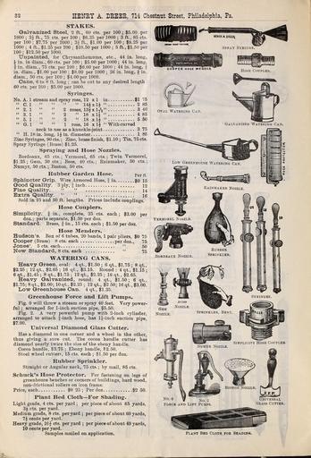 Keywords: Dreer's wholesale price list autumn edition September to December 1900 (15824882073).jpg 32 <br> HENRY A LREER 714 Chestnut Street Philadelphia Pa <br> STAKES <br> Galvanized Steel 2 ft 60 cts per 100 ; 5 00 per <br> 1000 ; 2£ ft 75 cts per 100 ; 6 35 per 1000 ; 3 ft 85 cts <br> per 100 ; 7 75 per 1000 ; 3 ft 1 00 per 100 ; 9 25 per <br> 1000 ; 4 ft 1 25 per 100 ; 10 50 per 1000 ; 5 ft 1 50 per <br> 100 ; 12 50 per 1000 <br> Unpainted for Chrysanthemums etc 44 in long <br> i in in diam 60 cts per 100 ; 5 00 per 1000 ; 44 in long <br> in diam 75 cts per 100 ; 6 00 per 1000 ; 44 in long <br> in diam 1 00 per 100 ; 8 00 per 1000 ; 36 in long £ in <br> diam 50 cts per 100 ; 4 00 per 1000 <br> Cane 6 to 8 ft long ; can be cut to any desired length <br> 60 cts per 100 ; 5 00 per 1000 <br> Syringes <br> No A 1 stream and spray rose 12 x 1 in 1 75 <br> C 1 14ixl£ 2 85 <br> 2 1 2 roses 13£xl T y 3 40 <br> 3 1 2 18 xH 4 85 <br> 5 1 2 18 xl 5 50 <br> G 1 1 rose 16 x l With curved <br> neck to use as a knuckle-joint 3 75 <br> H 18 in long lj in diameter 1 85 <br> Zinc Syringes 90 cts ; Zinc brass finish 1 10 ; Tin 75 cts <br> Spray Syringe Brass 1 25 <br> Spraying 1 and Hose Nozzles <br> Bordeaux 65 cts ; Vermorel 65 cts ; Twin Vermorel <br> 1 25; Gem 30 cts ; Boss 40 cts ; Rainmaker 50 cts ; <br> Numyr 50 cts ; Boston 50 cts <br> Rubber Garden Hose Per ft <br> Sphincter Grip Wire Armored Hose f in o 15 <br> Good Quality 3 ply f inch 12 <br> Pine Quality 14 <br> Extra Quality 16 <br> Sold in 25 and 50 ft lengths Prices include couplings <br> Hose Couplers <br> Simplicity f in complete 25 cts <br> doz ; parts separate 1 50 per doz <br> Standard Brass J in 15 cts each ; <br> each <br> 3 00 per <br> ; 1 50 per doz <br> Hose Menders <br> Hudson's Box of 6 tubes 20 bands 1 pair pliers 0 75 <br> Cooper Brass 8 cts each per doz 75 <br> Jones' 5 cts each 50 <br> New Standard 8 cts each 75 <br> WATERING CANS <br> Heavy Green oval 4 qt 1 50 ; 6 qt 1 75 ; 8 qt <br> 2 25 ; 12 qt 2 65 ; 16 qt 3 15 Round 4 qt 1 15 ; <br> 6 qt 1 45 ; 8 qt 1 75 ; 12 qt 2 25 ; 16 qt 2 65 <br> Heavy Galvanized round 4 qt 1 50 ; 6 qt <br> 1 75; 8qt 2 00; 10 qt 2 25; 12 qt 2 50; 16 qt 3 00 <br> Low Greenhouse Can 4 qt 1 35 <br> Greenhouse Force and Lift Pumps <br> Fig will throw a stream or spray 40 feet Very power- <br> ful ; arranged for 1-inch suction pipe 5 50 <br> Fig 2 A very powerful pump with 2-inch cylinder <br> arranged to attach f-inch hose has 1 -inch suction pipe <br> 7 00 <br> Universal Diamond Glass Cutter <br> Has a diamond in one corner and a wheel in the other <br> thus giving a sure cut The cocoa handle cutter has <br> diamond nearly twice the size of the ebony handle <br> Cocoa handle 3 75 ; Ebony handle 2 50 <br> Steel wheel cutter 15 cts each ; 1 50 per doz <br> Rubber Sprinkler <br> Straight or Angular neck 75 cts ; by mail 85 cts <br> Scbuck's Hose Protector For fastening on legs of <br> greenhouse benches or corners of buildings hard wood <br> non-frictional rollers on iron frame <br> Price each 0 25 ; Per doz 2 50 <br> Plant Bed Cloth ” For Shading <br> Light grade 4 cts per yard ; per piece of about 65 yards <br> 3£ cts per yard <br> Medium grade 8 cts per yard ; per piece of about 60 yards <br> 7j cents per yard <br> Heavy grade 10 J cts per yard ; per piece of about 40 yards <br> 10 cents per yard <br> Samples mailed on application 43768142 148705 77587 Page 32 Text http //www biodiversitylibrary org/page/43768142 1900 10 5962/bhl title 77587 Henry A Dreer Firm ; Henry G Gilbert Nursery and Seed Trade Catalog Collection NameFound Medium NameConfirmed Medium NameBankID 4904049 Biodiversity Heritage Library Dreer's wholesale price list autumn edition September to December 1900 seasonable flower vegetable seeds fertilizers tools etc Garden Stories Bulbs Plants Catalogs Flowers Nurseries Horticulture Seeds Vegetables U S Department of Agriculture National Agricultural Library bhl page 43768142 dc identifier http //biodiversitylibrary org/page/43768142 Henry A Dreer Firm bhlGardenStories Garden tools BHLinbloom bulbs plants nurseries horticulture u s department of agriculture national agricultural library henry a dreer firm bhlgardenstories bhlinbloom Information field Flickr posted date ISOdate 2015-02-04 CC-BY-2 0 BioDivLibrary https //flickr com/photos/61021753 N02/15824882073 2015-08-25 00 51 54 cc-by-2 0 PD-old-70-1923 Dreer's wholesale price list autumn edition September to December 1900 Photos uploaded from Flickr by Fæ using a script