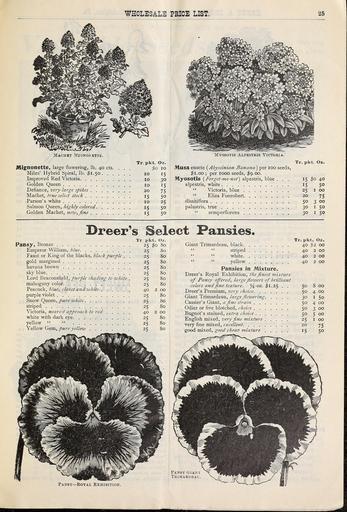 | Keywords: Dreer's wholesale price list autumn edition September to December 1900 (15822422554).jpg  WHOLESALE PRICE LIST <br> 25 <br> Machet Mignonette <br> Mignonette large flowering lb 40 cts <br> Miles' Hybrid Spiral lb 1 50 <br> Improved Red Victoria <br> Golden Queen <br> Defiance very large spikes <br> Machet true select stock <br> Parson's white <br> Salmon Queen highly colored <br> Golden Machet new fine <br> Tr pkt <br> Oz <br> 0 <br> 10 <br> 10 <br> IS <br> 10 <br> 30 <br> 10 <br> is <br> 20 <br> 75 <br> IS <br> So <br> 10 <br> 25 <br> IS <br> 5° <br> is <br> 50 <br> Myosotis Alpesthis Victoria <br> Musa ensete Abyssinian Banana per 100 seeds <br> 1 00 ; per 1000 seeds 9 00 <br> Myosotis Forget-me-not alpestris blue <br> alpestris white <br> Victoria blue <br> Eliza Fonrobert <br> dissitiflora <br> palustris true <br> semperflorens <br> Tr pkt Oz <br> 15 <br> 0 40 <br> 15 <br> 50 <br> 25 <br> 1 00 <br> 20 <br> 75 <br> So <br> 3 00 <br> 30 <br> 1 50 <br> 30 <br> 1 50 <br> Dreer's Select Pansies <br> Pansy Bronze <br> Emperor William blue <br> Faust or King of the blacks black purple <br> gold margined <br> havana brown <br> sky blue <br> Lord Beaconsfield purple shading to white <br> mahogany color <br> Peacock blue claret and white <br> purple violet <br> Snow Queen pure white <br> striped <br> Victoria nearest approach to red <br> white with dark eye <br> yellow <br> Yellow Gem pure yellow <br> Tr pkt <br> Oz <br> 25 0 <br> 80 <br> 25 <br> 80 <br> 25 <br> 80 <br> 25 <br> 80 <br> 25 <br> 80 <br> 2 S <br> 80 <br> 25 <br> 80 <br> 25 <br> 80 <br> 40 2 <br> OO <br> 25 <br> 80 <br> 25 <br> 80 <br> 25 <br> 80 <br> 40 2 <br> OO <br> 25 <br> 80 <br> 25 <br> 80 <br> 25 <br> 80 <br> Giant Trimardeau black <br> striped <br> white <br> yellow ' <br> Pansies in Mixture <br> Dreer's Royal Exhibition the finest mixture <br> of Pansy offered large flowers of brilliant <br> colors and fine texture y -oz 1 25 <br> Dreer's Premium very choice <br> Giant Trimardeau large flowering <br> Cassier's Giant a fine strain <br> Odier or five blotched choice <br> Bugnot's stained extra choice <br> English mixed very fine mixture <br> very fine mixed excellent <br> good mixed good cheat 1 mixture <br> Tr pkt Oz <br> 40 <br> 2 00 <br> 40 <br> 2 00 <br> 40 <br> 2 00 <br> 40 <br> 2 00 <br> 50 <br> 8 00 <br> 50 <br> 4 00 <br> 30 <br> 1 So <br> So <br> 4 00 <br> 5o <br> 3 00 <br> 5o <br> 5 00 <br> 25 <br> 1 00 <br> 20 <br> 75 <br> 15 <br> So <br> Pansy ” Royal Exhibition <br> Pansy Giant <br> Trimardeau 43768135 148705 77587 Page 25 Text http //www biodiversitylibrary org/page/43768135 1900 10 5962/bhl title 77587 Henry A Dreer Firm ; Henry G Gilbert Nursery and Seed Trade Catalog Collection NameFound Musa ensete NameConfirmed Musa ensete Gmelin EOLID 1119982 NameBankID 618296 NameFound MYOSOTIS NameConfirmed Myosotis EOLID 40769 NameBankID 2654540 NameFound Victoria NameConfirmed Victoria EOLID 34123 NameBankID 897688 Biodiversity Heritage Library Dreer's wholesale price list autumn edition September to December 1900 seasonable flower vegetable seeds fertilizers tools etc Garden Stories Bulbs Plants Catalogs Flowers Nurseries Horticulture Seeds Vegetables U S Department of Agriculture National Agricultural Library bhl page 43768135 dc identifier http //biodiversitylibrary org/page/43768135 Henry A Dreer Firm bhlGardenStories Pansys BHLinbloom bulbs plants nurseries horticulture u s department of agriculture national agricultural library henry a dreer firm bhlgardenstories bhlinbloom Information field Flickr posted date ISOdate 2015-02-04 CC-BY-2 0 BioDivLibrary https //flickr com/photos/61021753 N02/15822422554 2015-08-25 00 51 03 cc-by-2 0 PD-old-70-1923 Dreer's wholesale price list autumn edition September to December 1900 Photos uploaded from Flickr by Fæ using a script |