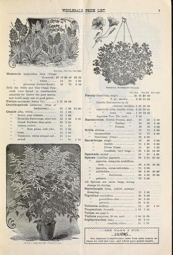| Keywords: Dreer's wholesale price list autumn edition September to December 1900 (16443997642).jpg  WHOLESALE PEICE LIST <br> Per doz Per 100 Per 1000 <br> Muscaria botyroides blue Grape <br> Hyacinth 0 10 0 <br> white 15 <br> plumosus Feathered Hyacinth 15 <br> Both the white and blue Grape Hya- <br> cinth were forced in considerable <br> quantity for Easter the past season <br> and found ready sale at good prices <br> Nerine sarniensis Guernsey Lily 1 25 10 <br> Ornithogalum Arabicum Star of <br> Bethlehem 25 1 <br> Oxalis alba white 15 1 <br> Bo wei rosy crimson 15 1 <br> Bermuda Buttercups selected bullis 15 1 <br> ' ' Grand Duchess deep pink 30 2 <br> Cernua yellow 15 <br> flora plena double yellow 25 1 <br> rosea 15 1 <br> Versicolor white striped red 15 1 <br> ' ' mixed 1 ' <br> 40 3 50 <br> 60 5 00 <br> 75 6 00 <br> 00 <br> 50 14 00 <br> 00 <br> 00 <br> 00 9 00 <br> 00 <br> 75 <br> 50 <br> 00 <br> Hi <br> 50 4 50 <br> oMK fc i AsTI <br> Bermuda Buttercup Oxalis <br> Per doz Per 100 Per 1000 <br> Pseony tenuifolia single 1 25 8 00 <br> fl pi double 2 00 15 00 <br> Double Harbaceous in 12 <br> choicest varieties 1 50 10 00 <br> mutabilis alba double white 2 50 20 00 <br> rosea rose 1 50 12 00 <br> Japanese Tree 75c each 7 50 <br> Ranunculus Double Persian mixed 10 50 3 00 <br> Turban 10 60 5 00 <br> French 10 50 3 00 <br> Scilla sibirica 15 75 6 00 <br> campanulata 15 75 6 00 <br> Peruviana Clusi 75 6 00 <br> Snowdrops single 10 60 5 00 <br> double 15 100 9 00 <br> Elwes' Giant 15 60 5 50 <br> Cassabah very large 20 1 25 10 00 <br> Sparaxis mixed 10 50 4 00 <br> Spiraea Astilbe japonica 50 3 50 30 00 <br> japonica compacta multiflora <br> true 60 4 00 38 00 <br> japonica aurea reticulata 75 5 00 <br> astilboides 60 4 50 40 00 <br> floribunda 60 4 00 38 00 <br> palmata 75 5 00 <br> All Spiraeas are extra large strong <br> clumps for forcing <br> Sternbergia lutea yellow autumn <br> flowering 15 1 00 <br> Tigridias conchiflora 30 2 00 <br> grandiflora alba 30 2 00 <br> pavonia 30 2 00 <br> Triteleia unidora 10 50 4 00 <br> Tropseolum Jarrattii 1 00 7 50 <br> Tulips see page 3 <br> Vallota purpurea 20 cts each 2 00 15 00 <br> Zephyrantb es rosea 25 2 00 <br> Candida white 25 1 50 <br> liliUmS <br> Our Japanese Longiflorums came from same source as <br> those we sold last year and which gave grand results 43768119 148705 77587 Page 9 Text http //www biodiversitylibrary org/page/43768119 1900 10 5962/bhl title 77587 Henry A Dreer Firm ; Henry G Gilbert Nursery and Seed Trade Catalog Collection NameFound Cernua NameConfirmed Cernua EOLID 4578743 NameBankID 176392 NameFound Muscaria NameConfirmed Muscaria NameBankID 266851 NameFound Nerine sarniensis NameConfirmed Nerine sarniensis EOLID 1010071 NameBankID 5845815 NameFound Ornithogalum NameConfirmed Ornithogalum L EOLID 29231 NameFound Oxalis NameConfirmed Oxalis sect Pseudobulbosae Norlind EOLID 40270 NameFound Oxalis alba NameConfirmed Oxalis alba NameBankID 9401054 NameFound Ranunculus NameConfirmed Ranunculus EOLID 37662 NameBankID 2576523 NameFound Scilla sibirica NameConfirmed Scilla sibirica EOLID 2027330 NameBankID 2662650 NameFound Sparaxis NameConfirmed Sparaxis Ker-Gawl EOLID 38091 NameFound Spiraea Astilbe japonica NameConfirmed Spiraea japonica Cambess EOLID 627220 NameBankID 7459214 NameFound Sternbergia lutea NameConfirmed Sternbergia lutea EOLID 1082456 NameBankID 2671088 NameFound Triteleia NameConfirmed Triteleia Kieffer 1906 EOLID 2721856 NameFound Vallota purpurea NameConfirmed Vallota purpurea Herb EOLID 11381984 Biodiversity Heritage Library Dreer's wholesale price list autumn edition September to December 1900 seasonable flower vegetable seeds fertilizers tools etc Garden Stories Bulbs Plants Catalogs Flowers Nurseries Horticulture Seeds Vegetables U S Department of Agriculture National Agricultural Library bhl page 43768119 dc identifier http //biodiversitylibrary org/page/43768119 bhlGardenStories Hyacinths Henry Dreer Oxalis Spirea BHLinbloom bulbs plants nurseries horticulture u s department of agriculture national agricultural library bhlgardenstories henry dreer bhlinbloom Information field Flickr posted date ISOdate 2015-02-04 CC-BY-2 0 BioDivLibrary https //flickr com/photos/61021753 N02/16443997642 2015-08-25 00 50 13 cc-by-2 0 PD-old-70-1923 Hyacinthus Hyacinthaceae Oxalis Dreer's wholesale price list autumn edition September to December 1900 Photos uploaded from Flickr by Fæ using a script |