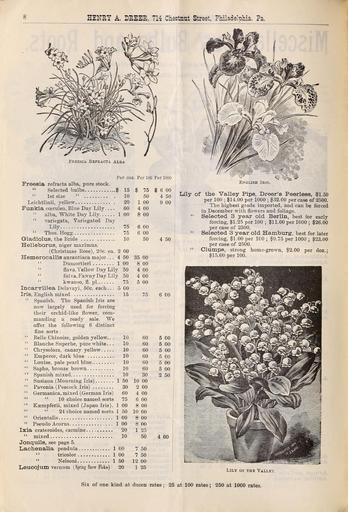 | Keywords: Dreer's wholesale price list autumn edition September to December 1900 (16257273868).jpg HENRY A DREER 714 Chestnut Street Philadelphia Pa <br> Fkeesia Refeacta alba- <br> Per doz Per 100 Per 1000 <br> Freesia refracta alba pnre stock <br> Selected bulbs 15 75 6 00 <br> 1st size 10 50 4 50 <br> Leichtlinii yellow 20 1 00 9 00 <br> Funkia coerulea Blue Day Lily 60 4 00 <br> alba White Day Lily 1 00 8 00 <br> variegata Variegated Day <br> Lily 75 6 00 <br> Thos Hogg 75 6 00 <br> Gladiolus the Bride 10 50 4 50 <br> Helleborus niger maximus <br> Christmas Rose 20c ea 2 00 <br> Hemerocallis aurantiaca major 4 50 35 00 <br> ' ' Dumortieri 1 00 8 00 <br> flava Yellow Day Lily 50 4 00 <br> fulva Fawny Day Lily 50 4 00 <br> kwanso fl pi 75 5 00 <br> Incarvillea Delavayi 50c each 5 00 <br> Iris English mixed 15 75 6 CO <br> Spanish The Spanish Iris are <br> now largely used for forcing <br> their orchid-like flower com- <br> manding a ready sale We <br> offer the following 6 distinct <br> fine sorts <br> Belle Chinoise golden yellow 10 60 5 <br> Blanche Superbe pare white 10 60 5 <br> 1 ' Chrysolora canary yellow 10 60 5 <br> Emperor dark blue 10 60 5 <br> Louise pale pearl blue 10 60 5 <br> Sapho bronze brown 10 60 5 <br> ' ' Spanish mixed 10 30 2 <br> Susiana Mourning Iris 150 10 00 <br> Pavonia Peacock Iris 30 2 00 <br> Germanica mixed German Iris 60 4 00 <br> 10 choice named sorts 75 6 00 <br> Kffimpferii mixed Japan Iris 1 00 8 00 <br> 24 choice named sorts 1 50 10 00 <br> Orientalis 100 8 00 <br> Pseudo Acorns 100 8 00 <br> Ixia crateroides carmine 20 1 25 <br> mixed 10 50 4 00 <br> Jonquils see page 5 <br> Lachenalia pendula 100 7 50 <br> ' ' tricolor 1 00 7 50 <br> Nelsoni 1 50 12 00 <br> Leucojum vernum Spring Snow Flake- 20 1 25 <br> 00 <br> 00 <br> 00 <br> 00 <br> 00 <br> 00 <br> 50 <br> English Ibis <br> Lily of the Valley Pips Dreer's Peerless 1 50 <br> per 100 ; 14 00 per 1000 j 32 00 per case of 2500 <br> The highest grade imported and can be forced <br> in December with flowers and foliage <br> Selected 3 year old Berlin best for early <br> forcing 1 25 per 100 ; 11 00 per 1000 ; 26 00 <br> per case of 2500 <br> Selected 3 year old Hamburg best for later <br> forcing 1 00 per 100 ; 9 75 per 1000 ; 23 00 <br> per case of 2500 <br> Clumps strong home-grown 2 00 per doz ; <br> 15 00 per 100 <br> Lily or the Valley <br> Six of one kind at dozen rates ; 25 at 100 rates ; 250 at 1000 rates 43768118 148705 77587 Page 8 Text http //www biodiversitylibrary org/page/43768118 1900 10 5962/bhl title 77587 Henry A Dreer Firm ; Henry G Gilbert Nursery and Seed Trade Catalog Collection Biodiversity Heritage Library Dreer's wholesale price list autumn edition September to December 1900 seasonable flower vegetable seeds fertilizers tools etc Garden Stories Bulbs Plants Catalogs Flowers Nurseries Horticulture Seeds Vegetables U S Department of Agriculture National Agricultural Library bhl page 43768118 dc identifier http //biodiversitylibrary org/page/43768118 Henry A Dreer Firm bhlGardenStories Iris Lily of the Valley Freesia BHLinbloom bulbs plants nurseries horticulture u s department of agriculture national agricultural library henry a dreer firm bhlgardenstories lily of the valley bhlinbloom Information field Flickr posted date ISOdate 2015-02-04 CC-BY-2 0 BioDivLibrary https //flickr com/photos/61021753 N02/16257273868 2015-08-25 00 50 16 cc-by-2 0 PD-old-70-1923 Freesia Dreer's wholesale price list autumn edition September to December 1900 Photos uploaded from Flickr by Fæ using a script |