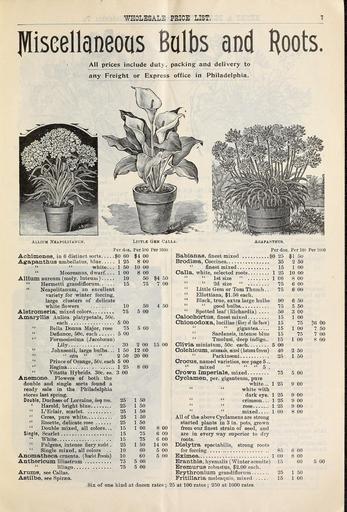 Keywords: Dreer's wholesale price list autumn edition September to December 1900 (16418950016).jpg WHOLESALE PRICE LIST <br> Ittiseellaneoas Bulbs and Hoots <br> All prices include duty packing and delivery to <br> any Freight or Express office in Philadelphia <br> Allium Neapolitanum <br> Little Gem Calla <br> Per doz Per 100 Per 1000 <br> Achimenes in 6 distinct sorts 0 60 <br> Agrapanthus umbel at us blue 1 25 <br> white 1 50 <br> Mooreanus dwarf 1 00 <br> Allium aureum moly luteum 10 <br> Hermetti grandiflorum 15 <br> Neapolitanum an excellent <br> variety for winter forcing <br> large clusters of delicate <br> white flowers 10 <br> Alstromeria mixed colors 75 <br> Amaryllis Aulica platypetala 50c <br> each 5 00 <br> Bella Donna Major rose 75 <br> Defiance 50c each 5 00 <br> Formosissima Jacobean <br> Lily 30 <br> Johnsonii large bulbs 1 50 <br> extra 2 50 <br> Prince of Orange 50c each 5 00 <br> Eegina 1 25 <br> Vitatta Hybrids 30c ea <br> Anemone Flowers of both the <br> double and single sorts found a <br> ready sale in the Philadelphia <br> stores last spring <br> Double Duchess of Lorraine deep rose <br> 4 00 <br> 8 00 <br> 10 00 <br> 8 00 <br> 50 <br> 75 <br> 50 <br> 5 00 <br> 5 00 <br> 2 00 <br> 12 00 <br> 20 00 <br> 8 00 <br> 4 50 <br> 7 00 <br> 4 50 <br> 15 00 <br> 3 00 <br> 25 1 50 <br> 25 <br> 1 50 <br> 25 <br> 1 50 <br> 25 <br> 1 50 <br> 25 <br> 1 50 <br> Double mixed all colors <br> 15 <br> 1 00 <br> 8 00 <br> 15 <br> 75 <br> 6 00 <br> White <br> 15 <br> 75 <br> 6 00 <br> ' ' Fulgens intense fiery scarlet <br> 25 <br> 1 50 <br> 14 00 <br> Single mixed all colors <br> 10 <br> 60 <br> 5 00 <br> Anomatheca cruenta Scarlet Freesia <br> 10 <br> 60 <br> 5 00 <br> 75 <br> 5 00 <br> 75 <br> 5 00 <br> Arums see Callas <br> Astilbe see Spiraea <br> Six of one <br> kind at dozen rates ; <br> Per doz <br> Babianas finest mixed 0 25 <br> BrodisBa Coccinea 35 <br> 15 <br> 00 <br> 40 <br> 25 <br> finest mixed 15 <br> Calla white selected roots 1 25 <br> 1st size 1 00 <br> 2d size 75 <br> ' ' Little Gem or Tom Thumb 75 <br> Ellottiana 1 50 each <br> Black true extra large bulbs <br> good bulbs <br> Spotted leaf Richardia <br> Calochortus finest mixed <br> Chionodoxa lucillae Glory of the Snow <br> gigantea 15 <br> Sardensis intense blue 15 <br> Tmolusi deep indigo <br> Olivia miniatum 50c each <br> Colchicum autumaale mixed Autumn Crocus <br> Parkinsoni <br> Crocus named varieties see page 5 <br> mixed 5 <br> Crown Imperials mixed 75 <br> Cyclamen per giganteum pure <br> white 1 25 9 00 <br> white with <br> dark eye <br> crimson <br> rose <br> mixed <br> All of the above Cyclamens are strong <br> started plants in 3 in pots grown <br> from our finest strain of seed and <br> are in every way superior to dry <br> roots <br> Dielytra spectabilis strong roots <br> forforcing 85 6 00 <br> Eximea 1 00 8 00 <br> Branthis hyemalis Winter aconite 15 60 <br> Bremurus robustus 2 00 each <br> Brythronium grandiflorum 25 1 <br> Fritillaria meleaquis mixed 15 1 <br> 25 at 100 rates ; 250 at 1000 rates <br> Per 100 Per 1000 <br> 1 50 <br> 2 50 <br> 1 00 <br> 10 00 <br> 8 00 <br> 6 00 <br> 6 00 <br> 50 <br> 50 <br> 00 <br> 00 <br> 75 <br> 00 <br> 75 <br> 00 <br> 2 50 <br> 1 50 <br> 5 00 <br> 9 00 <br> 9 00 <br> 9 00 <br> 8 00 <br> 6 00 <br> 7 50 <br> 7 00 <br> 8 00 <br> 5 00 <br> 50 <br> 00 43768117 148705 77587 Page 7 Text http //www biodiversitylibrary org/page/43768117 1900 10 5962/bhl title 77587 Henry A Dreer Firm ; Henry G Gilbert Nursery and Seed Trade Catalog Collection NameFound Achimenes NameConfirmed Achimenes EOLID 5644979 NameBankID 3408836 NameFound Agrapanthus NameFound ALLIUM NameConfirmed Allium EOLID 11378177 NameBankID 2662323 NameFound Allium aureum NameConfirmed Allium aureum Lam EOLID 1084730 NameBankID 11167307 NameFound Alstromeria NameFound Anomatheca cruenta NameConfirmed Anomatheca cruenta Lindl EOLID 5866081 NameBankID 5823009 NameFound Astilbe NameConfirmed Astilbe EOLID 11171526 NameBankID 2649623 NameFound Aulica platypetala NameConfirmed Aulica platypetala Lindl Raf EOLID 1001200 NameFound Branthis hyemalis NameConfirmed Eranthis hyemalis Linnaeus Salisbury EOLID 594849 NameFound Bremurus robustus NameConfirmed Arrenurus robustus Koenike 1894 EOLID 3195860 NameFound Brythronium grandiflorum NameConfirmed Erythronium grandiflorum Pursh EOLID 1088097 NameBankID 471023 NameFound Calochortus NameConfirmed Calochortus EOLID 45417 NameBankID 2662473 NameFound Chionodoxa NameConfirmed Chionodoxa Boiss EOLID 1392558 NameBankID 471207 NameFound Coccinea NameConfirmed Coccinea Feuillet J M MacDougal supersect NameBankID 9261559 NameFound Colchicum NameConfirmed Colchicum L EOLID 33203 NameFound Dielytra spectabilis NameConfirmed Dielytra spectabilis NameBankID 9196415 NameFound Eegina NameFound Formosissima NameFound Fritillaria NameConfirmed Fritillaria EOLID 17822 NameBankID 593086 NameFound Hermetti grandiflorum NameFound Mooreanus NameFound Neapolitanum NameFound Olivia miniatum NameConfirmed Clivia miniata Lindl Bosse NameFound Richardia NameConfirmed Richardia EOLID 29640 NameBankID 387684 NameFound Spiraea NameConfirmed Spiraea EOLID 29951 NameBankID 2650385 Biodiversity Heritage Library Dreer's wholesale price list autumn edition September to December 1900 seasonable flower vegetable seeds fertilizers tools etc Garden Stories Bulbs Plants Catalogs Flowers Nurseries Horticulture Seeds Vegetables U S Department of Agriculture National Agricultural Library bhl page 43768117 dc identifier http //biodiversitylibrary org/page/43768117 Henry A Dreer Firm bhlGardenStories Calla Allium Agapanthus BHLinbloom bulbs plants nurseries horticulture u s department of agriculture national agricultural library henry a dreer firm bhlgardenstories bhlinbloom Information field Flickr posted date ISOdate 2015-02-04 CC-BY-2 0 BioDivLibrary https //flickr com/photos/61021753 N02/16418950016 2015-08-25 00 56 35 cc-by-2 0 PD-old-70-1923 Zantedeschia aethiopica Unidentified Allium Unidentified Agapa
