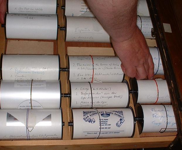 Keywords: DrehorgelRollen.jpg Description rolls of a barrel organ Source photographed --Immanuel Giel 12 54 6 Jun 2005 UTC Barrel organs Music rolls Punched tapes