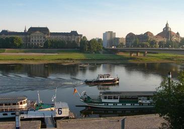 Keywords: Dresden-Elbe02.jpg Die Elbe in Dresden Sachsen Deutschland Im Bild Der Schiffsanleger Terrassenufer im Hintergrund das Sächsische Finanzministerium links die Sächsische Staatskanzlei rechts und die Carolabrücke The Elbe River in Dresden Saxony Germany View to the Saxon treasury Saxon state chancellery and Carola Bridge own Nikater 2005-09-04 Own work all rights released Public domain 51 053150 13 744474 Heading NE Elbe in Dresden