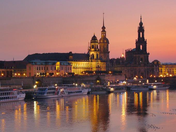Keywords: dresden night cathedral skyline dusk twilight sunset sky colorful architecture cityscape water reflection river urban historic church tourist germany europe view travel tourism