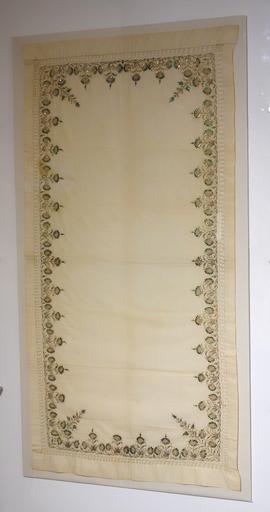 | View Original: | Dresser scarf, Delhi, India, early 20th century, cotton, silk, flat silver wire, gold thread, beetle carapace, sequins - Textile Museum of Canada - DSC01026.JPG (2640x5011) | |||