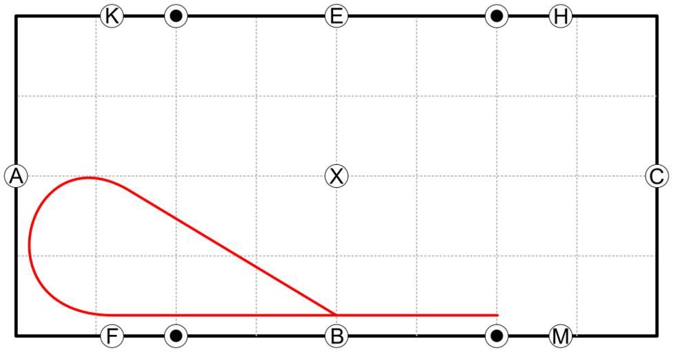 Keywords: Dressurviereck - Aus der Ecke kehrt quer.svg Dressurviereck 20x40 Meter mit Bahnfigur Aus der Ecke kehrt rote Linie eingezeichnet Own 2006-08-28 Andreas 06 Category Riding figures Riding figures Half-pass