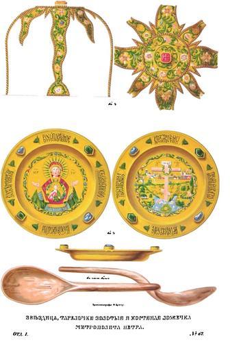 | Keywords: Drevnosti RG v1 ill068.jpg ru Д евности Российского госуда ства Antiquities of Russian country 1846 1853 Т 1 Иллюст ато Солнцев Фёдо Г иго ьевич Звездица та елочки золотые и костяная ложечка мит ополита Пет а В изнице московского Успенского собо а звездица пок ывающая дискос богата по металлу и по ук ашениям финифтью и д агоценными камнями Состоя из четы ех луков между коими четы е луча она об азует восьмиконечную звезду подобие небесного светила путеводившего волхвов в Вифлеем а ней читаем следующую надпись лtта /--зч`г 1585 мtсmца їюлїm въ и` день сдtлана бысть сїа звtзда въ собо нuю иb апостольскuю це ковь П ечистыm Бого одицы честнагw иb славнагw Еm Успенїm п и благовt номъ Ца t иb Великомъ Кнmзt Fеодо t Icоанновичt повелtнїемъ Господина П еосвmщеннаго Дїонисїm ит ополїта всеm Росїи К ней п инадлежат два золотых блюдца а одном наведен финифтью восьмиконечный к ест на Голгофе с те новым венцом на с едок естии и с надписью по к аям К естu твоемu покланmемсm Влыдыко и п оч а на д угом Воплощение в виде Знамения Богомате и и с надписью вок уг Все оуrпованїе мое къ Тебt возлагаю ати Божїm сох ани мm во Своемъ си к овt К ая обоих блюдец усажены изум уами и яхонтами в гнездах аконец на этом же исунке п едставлена ложка из ыбьей кости п инадлежавшая по п еданию Пе восвятителю московскому Пет у но в собо ной описи 1628 г она названа «лжицею св Ионы ит ополита» В собо ной же описи 1627 г упомянуты «ложка костяная на кольце обложена се еб ом лжичка и во во ка низана жемчугом» По-видимому лжица сия п инадлежит к келейной а не к це ковной утва и 1846 1853 http //www runiverse ru/bookreader/book403605/ page/61/mode/1up Солнцев Фёдо Г иго ьевич PD-Art Antiquities of Russian country - Volume I Files uploaded by Shakko from various sources Uploaded with UploadWizard Asterisk liturgy Diskos from Russia Spoons in art Peter of Kiev |