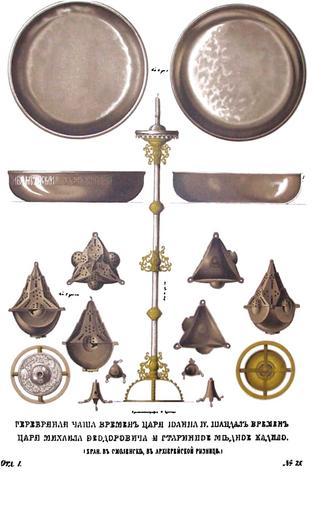 | Keywords: Drevnosti RG v1 ill076.jpg  ru Д евности Российского госуда ства Antiquities of Russian country 1846 1853 Т 1 Иллюст ато  Солнцев Фёдо Г иго ьевич Се еб яная чаша в емен ца я Иоанна IV шандал в емен ца я  ихаила Федо овича и ста инное медное кадило х анятся в Смоленске в А хие ейской  изнице Сии це ковные утва и  азных веков и  азного стиля х анятся в А хие ейской  изнице в Смоленске Чаша се еб яная по-видимому водосвятная; подпись к угом ее венчика свидетельствует что утва ь эта уст оена п и ца е Иоанне Васильевиче Шандал или п авильнее выносной подсвечник се еб яный отличается к асивостью  исунка и чистотой  аботы не позднее XVII в Пе ехваты и вычу ные его к онштейны вызолочены  едное кадило замечательно как д евностью своей так и необыкновенной фо мой; сквозная к ышка его похожа на шат овый ве х це кви 1846 1853 http //www runiverse ru/bookreader/book403605/ page/61/mode/1up Солнцев Фёдо Г иго ьевич PD-Art Antiquities of Russian country - Volume I Files uploaded by Shakko from various sources Uploaded with UploadWizard Thuribles from Russia Silver plates in art |