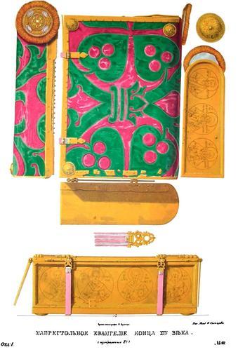| Keywords: Drevnosti RG v1 ill081.jpg ru Д евности Российского госуда ства Antiquities of Russian country 1846 1853 Т 1 Иллюст ато Солнцев Фёдо Г иго ьевич ап естольное Евангелие конца XIV в изоб ажение 1 Ха атейное сие Евангелие в десть писанное уставом пе еплетено в ба хат; ве хняя доска его обложена вызолоченным се еб ом со сканью по к аям зак аи из того же металла с финифтяными изоб ажениями святых Еф ема Саввы Евфимия иколая и ликийского т ех вселенских святителей из московских одного Пет а из остовских Леонтия и п еподобного Се гия По к аям лицевой доски вы езана следующая надпись В лtто /--з`ц 1392 а т индикта л`а оковано быс Еvаг`лїе се п и Велиц`tмъ Княз`t Васильи Дмит їевичt всеа РУ си и П есвещ`нм Кип їан ит ополитt Кїевскомъ всеа РУ си повеленьем а ба Бж`я Fеодо а Анд tевича Последнее имя вст ечается нам в 1371-м и 1389 г между послухами духовного завещания великого князя Дмит ия Ивановича а пе вом листе Евангелия читаем собственно учную подпись мит ополита Платона «Сие Евангелие дано от Великаго Князя Василия Димит иевича подписал сми енный Платон ит ополит осковский и А химанд ит Т оицы Се гиевой лав ы 1798 года» о из пе вой надписи не видно чтобы оно дано было в Се гиеву обитель самим великим князем а только в его княжение уст оено повелением Федо а Анд еевича кото ый был московский боя ин и ве оятно б ат боя свидетельствовавших духовную Великокняжескую Александ а и д угого Федо а Александ овичей Хотя надпись эта п ямо указывает нам на 1392 г уст оения оклада на Евангелие но сему п отиво ечит изоб ажение на нем п еподобного Се гия кото ый п еставился в том же самом году а св мощи его отк ыты и п ославлены в 1425 г Из этого можно с ве оятностью заключать что п и позднейшем возобновлении и ук ашении оклада п исоединен об аз п еподобного основателя Т оицкой лав ы 1846 1853 http //www runiverse ru/bookreader/book403605/ page/61/mode/1up Солнцев Фёдо Г иго ьевич PD-Art Antiquities of Russian country - Volume I Gospel Books covers from Russia Files uploaded by Shakko from various sources Uploaded with UploadWizard Vasily I of Moscow 1392 books Cyprian Metropolitan of Moscow Platon Levshin |