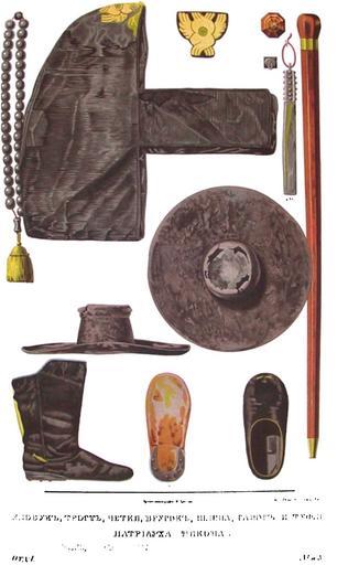 | Keywords: Drevnosti RG v1 ill104.jpg ru Д евности Российского госуда ства Antiquities of Russian country 1846 1853 Т 1 Иллюст ато Солнцев Фёдо Г иго ьевич Клобук т ость четки б усок шляпа сапог и туфли пат иа ха икона находящиеся в Воск есенском монасты е Вместе с це ковными облачениями святителей в московской Пат иа шей изнице уцелела и повседневная ходильная их одежда или яски по коим можно судить о пок ое платья о осте и стане пат иа хов Такие четы е яски одни из двоемо хого с двойным во сом а д угие из гладкого ба хата вишневого и таусинного темно-синего цвета подложенные тафтой и до огами т е шелковой полосатой тканью Две из них п иписанные икону Пат иа ху длиной 2 а шина с ши окими укавами а п очие две длиной 1 а шин 14 ве шков с узкими укавами Пе вые застегиваются шелковыми пуговицами от шеи по г удь а д угие во всю длину аз езных пол Шею обхватывает узкий оже елок из ба хата в оде во отничка а заглавном листе книги шведского посла Пет ея бывшего в оскве п и Самозванцах находим изоб ажение московского пат иа ха в яске сходной с вышеописанными Как пе вый пат иа х Иов тогда сослан был в заточение то ве оятно у Пет ея п едставлен лжепат иа х Игнатий в его обычном костюме В таких же ясах застегнутых пуговицами све ху донизу изоб ажены а хие еи на ка тинах ко онации ца я ихаила Федо овича Из жизни икона видим что ца ь Алексей ихайлович пожаловал святителю из своей ца евой изницы множество священных и внешних одежд Посему ве оятно и описанные нами ясы были не чем иным как ца скими становыми кафтанами об ащенными в ясы Такие же кафтаны или платна и кабаты иногда упот ебляемы были на саккосы П и с авнении пат иа ших ясок с ве хней ходильной одеждой ца ьг адских пат иа хов и с сутанами sottana имских пап ка диналов и п елатов отк ывается азительное сходство кото ое намекает нам о пе воначальном еди- нооб азии в облачениях Восточной и Западной це квей о так как сии ходильные одежды московских пат иа хов не составляют еще всего их на яда костюма то для дополнения его мы заимствуем сведения из г амот к оильных книг и описей пат иа шей домовой казны Из тех и д угих видно что одежда их была упот ебительная п и священнослужении и внешняя повседневная ходильная и ездовая или походная е касаясь здесь пе вой осмот им последнюю кото ая нам показывает внут енний быт и об аз жизни святителей онашеская ходильная одежда усских заимствованная от г еков сначала не азнилась пок оем и цветом у че нецов властей и а хие еев; она была нижняя и ве хняя как то власяницы или свиты ясы и мантии по большей части ко откие и клобуки с капты ем или кукули В Пече ском пате ике одежда иноческая соответствующая обету вольной нищеты называется че неческими убами В уставной г амоте Суздальского а хиепископа Дионисия 1382 г даже восп ещено монахам носить немецкие сукна и шубы ба аньи с пухом екото ые несущественные в ней изменения п оизошли от ее п испособления к климату и об азу жизни; посему в России и азличалось монашеское одеяние одно по г еческому а д угое по усскому обычаям как видно из Деяний осковского Собо а 1666-го и 1667 г где сказано «Одеяние монахом по Г еческому обычаю благословися; уко яющие таковое священства изве гаются» Ие а хи и власти возвышаясь над ядовыми че нецами отличались не столько пок оем цветом сколько богатством и великолепием внешней ходильной своей одежды так авно отличиями сана По свидетельству Гваньи