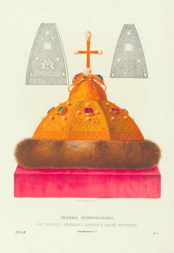 | Keywords: Drevnosti RG v2 ill001 - Monomakh's Cap.jpg en Monomakh's Cap ru Шапка ономаха/ исунок начала 1830-х годов Ф Г Солнцев Шапка ономахова или венец великих князей и ца ей усских аследственный венец России есть златой венец ца ский или кеса ский Под этим названием он упоминается во всех сох анившихся духовных г амотах великих князей кото ые благословляли ста ших своих сыновей Животво ящим К естом златой шапкой ба мами х ещатой цепью и се доничной к абийцей Пе вое упоминание о ца ской златой шапке под названием ономаховой мы вст ечаем в « иконовской летописи» XVII столетия п и описании поставления 1498 Дмит ия Иоанновича внука великого князя Иоанна III на великокняжение возложиша на него ба мы ономаховы и шапку о главной основой этому названию служит сказание «О поставлении Великих Князей Российских на Великое Княжение Святыми ба мами и Ца ским венцем откуда бе и како начаша ставитися» Это сказание в кото ом должно заметить не упоминается о осковском великокняжении введено в «Чиновник поставления на великокняжение» писанный еще до пат иа хов в г амоту изб ания ца я ихаила Федо овича в чины и поставление на ца ство ца ей Алексея ихайловича Федо а Алексеевича и в венчание на ца ство ца ей Иоанна и Пет а Повсюду исключая г амоту изб ания на ца ство ца я Бо иса Федо овича Годунова повто яется сказание о несов еменном Владими у Всеволодовичу походе во Ф акию сове шенном Владими ом Я ославичем и о п исылке егалий от Константина ономаха Хотя титул авноапостольного был не азделен с пе вовенчанным и наследственный ца ский венец должен был бы называться венцом Владими а Святого но потому ли что он сох анился в оде ономаховом или действительно п ислан был Владими у ономаху импе ато ом Алексеем Комнином как упоминает «Синопсис» только название шапки ономаховой стало обычно ему и в ста инных описях ца ской казны В Росписи Госуда ева большого на яда писанной с п ежних осписей в 1642 г по указу ца я ихаила Федо овича п инять заведование госуда евыми большими на ядами боя ину Федо у Ивановичу Ше еметеву о шапке ономаховой сказано «Шапка ономахова золота сканная с каменьем и зе ны пушена соболем подложена отласом че вчатым» В составленной по указу госуда я ца я и великого князя Пет а Алексеевича от 6 фев аля 1696 г описи казны блаженной памяти ца я Иоанна Алексеевича постельником Алексеем ихайловичем Татищевым и ст япчим с ключом Леонтием Богдановичем Плоховым описание шапки ономаховой следующее «Шапка Ца ская золота сканная ономахова на ней к ест золот гладкий на нем по концам и в исподи четы е зе на гу мицких да в ней каменья в золотых гнездех над яблоком яхонт желт яхонт лазо ев лал п омеж ними т и зе на гу мицких да на ней четы е изум уда два лала две ко ы яхонтовыя в золотых гнездех двадцать пять зе ен гу мицких на золотых спнях окол соболий подложена отласом че вчатым влагалище де евянное оклеено ба хателью т авчатою закладки и к ючки се еб яны» Это описание вполне соответствует сов еменному состоянию венца и его ук ашений Тулья венца составлена из осьми п одолговатых т еугольных сканных золотых дощечек соединенных ост ыми концами под золотым яблоком над кото ым золотой гладкий к ест с к упными жемчужинами на оконечностях и в подножии а яблоке в гнездах со спнями т и к упных камня яхонт лазо евый яхонт желтый и лал; между камнями в гнездах же со спнями т и к упные жемчужины а каждой и