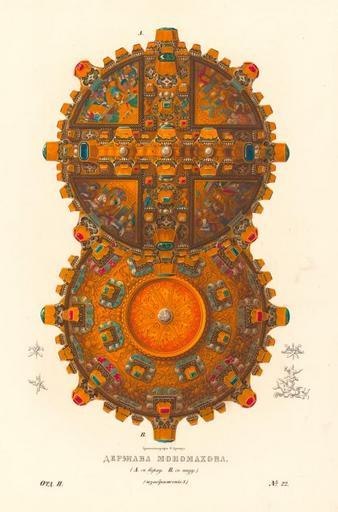Keywords: Drevnosti RG v2 ill022.jpg ru Де жава ономахова Де жава знаменование освященного к естного п еобладания над землей в поставлениях на ца ство называется Ца ским златым де жавным яблоком или яблоком владомым в ста ых описях ца ской Большой казны яблоком великоде жавным Идея всеми ного елигиозного п еобладания п инадлежит х истианству а потому и символ ее п оявился во в емена Августа и вы азился в Риме изоб ажением победы на ша е п едставляющем землю но со в емени водво ения х истианства в Константинополе вседе жавие ознаменовалось к естом осеняющим ми До XI века де жавы г еческих импе ато ов были с большим к естом сходным с описываемой «Де жавою Российскаго Ца ствия» п исланной из Г еции и носящей название « ономаховой»; после же XI столетия как можно видеть на монетах де жавы имеют подобие с изоб аженной под 24 с небольшим к естом Эта фо ма усской ца ской де жавы а авно византийские финифтяные ук ашения кои были впоследствии об азцом для подобных п оизведений в Венеции служат д агоценным памятником искусства X столетия Яблоко великоде жавное ук ашено пятьюдесятью восемью алмазами г еческой г ани восьмьюдесятью девятью яхонтами че вчатыми двадцатью т емя яхонтами лазо евыми пятьюдесятью изум удами и т идцатью семью жемчужинами в золотых финифтяных гнездах В четы ех т еугольных полях яблока финифтяные изоб ажения 1 помазание Давида п о оком Самуилом на ца ство; 2 победа над Голиафом; 3 возв ащение с победы; 4 гонение от ца я Саула Де жава в ок ужности 13 ве шков высота с к естом 9 1/2 ве шка Около блях со всех четы ех сто он символические изоб ажения о ла льва г ифа и едино ога В описи 1642 г Большой казны ца я и великого князя ихаила Федо овича сказано «Яблоко золото чеканное с финифты на нем к ест Де жава Российскаго Ца ствия; около яблока и к еста каменья алмазы и яхонты че вчатые и лазо евые и изум уды и зе ны гу мицкие ф яжское дело н`л г 1643 майя 25 по Госуда еву Ца еву и Великаго Князя ихаила Федо овича всея Руси указу по п иказу боя ина Федо а Ивановича Ше еметева отнесено в П иказ золотово дела Госуда ева большаго на яду яблоко золотое чеканное пе ек епить каменье кои шатаютца да пе еп авить на яблоках к ест для тово что шатаетца А в П иказе золотово дела в яблоке каменья кои шатались пе ек еплены и на яблоке к ест пе еп авлен; пе еменены под к естом над яблоком две дужки золотые а в то место положены новые две дужки золотые весу в новых дужках четы е золотника а в ста ых полто а золотника Июня в 4 день из П иказа золотово дела яблоко в казну взято а ста ые две дужки золотые отданы в П иказ золотово дела подьячему Богдану Силину; отнес дьяк А по осмот у Боя ина Федо а Ивановича Ше еметева да казначея Богдана инича Дуб овскаго да дьяков Г иго ья Панк атьева да Алмаза Иванова вве ху над яблоком в к есте 18 алмазов не великих 36 яхонтов че вчатых не великих 10 яхонтов лазо евых величиною се едние 22 изум уда се едних и малых 21 зе но гу мицкое больших и се едних; на ве хней половине яблока под к естом 52 яхонта че вчатых не великих 32 алмаза не великих 15 изум удов с едних и малых 9 яхонтов лазо евых се едних; 30 жемчюжин не великих В нижней половине яблока 8 алмазов не великих 4 яхонта че вчатых 4 яхонта лазо евых се едних 16 изум удов не великих» Опись эта соответствует и настоящему состоянию де жавы исключая что в к есте недостает т ех яхонтов «не великих» двух изум удов и четы надцати зе е