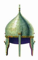 | Keywords: Drevnosti RG v3 ill014a - Helm of Kuchum.jpg  Шапка Е ихонская булат к асной по булату венец и ушки наведены т авы по на езке золотой у каймы под венцом опушка золотая чеканная в опушке в венце восемь камешков че вчатых да восемь лазо евых смазней да в венце над ушьми по лалику; уши п о езные на ушках на п о езке по лалу; опушка около ушей се еб еная в опушке в обоих ушах по шти би юзок да по шти иско ок яхонтовых и лаликовых; в ушах же по колечку п ивязному золотому; у затылка кайма около наведены сусальным золотом; у затылка ж т и чепи се еб еные золоченые; в затылках же по к аям семь гвоздей се еб еных золоченых ок епочных чем ок еплена подкладка; на носу наведены т авы чеадайские по на езке золотом наве ху зе но бу мицкое; подве шье т авы мелкие чеадайские наведены золотом по на езке; го одок золотой наведен финифты  озными на ф яское дело; подкладка отлас че вчат; завязки у тое шапки отлас желтой; на затылке бывало золочено сусальным золотом; в золотом венце шесть мест по озших выпалых камышков; в п ежних пе еписных книгах под тою статьею написано по сказке масте ов «бывала та шапка Кучумовская уда ил челом Госуда ю Бо ис Пет ович Ше еметев» А по нынешней пе еписи  ч`є года 1687 и по осмот у та шапка п отив п ежних пе еписных книг сошлась завязок нет цена двести двадцать  ублев; а в п ежней описной книге написана вто ая Д евности Российского госуда ства http //www belygorod ru/img2/Solncev/Used/0ShishakIliErihons jpg < 1853 Солнцев Фёдо Г иго ьевич PD-old Antiquities of Russian country - Volume III Kuchum Jerico cap Erikhonka |