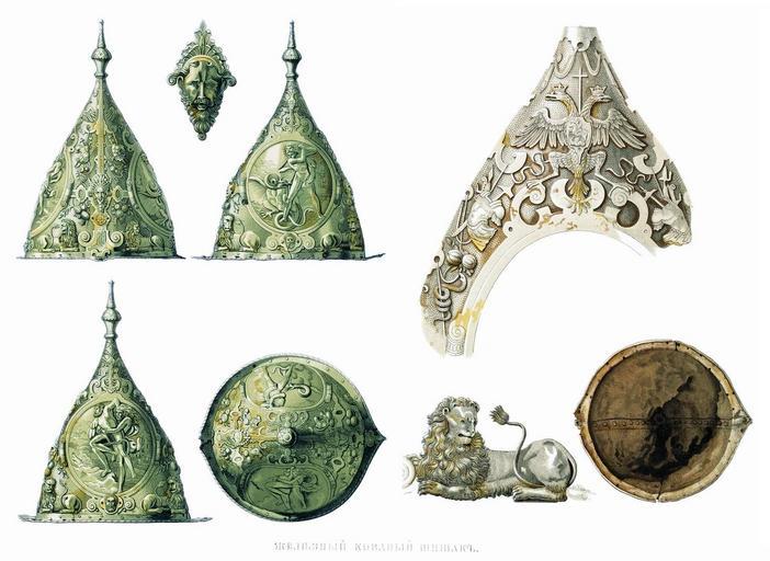 Keywords: Drevnosti RG v3 ill017-018.jpg Авст ийский пода очный шлем Поднесён Павлом Сапегой от польского ко оля Сигизмунда III Фёдо у Иоанновичу Х анящийся в О ужейной палате железный шлем под 48 в описных книгах 1687-го и 1701 г под заглавием «Шапки емецкие и Калмыцкие» помещен пе вым «Шапка чеканная золочена Цеса ское дело; в ней два клейма больших в них люди; в одном клейме человек бьет змея но выше клеем по о лу двоеглавому в них по человеку на коне; меж клеем по личине; пониже клеем четы е льва; и люди и о лы и личины и львы и змейки и т авки золочены А по нынешней пе еписи ч`є года и по осмот у та шапка п отив п ежних пе еписных книг сошлась; цена сто ублей» а этом стальном золоченом шлеме п евосходного чекана сов еменного искусству Бенвенуто Челлини на двух больших клеймах изоб ажен Ге кулес по ажающий Ле нейскую гид у и удушающий в бо ьбе великана Антея а вычеканенном ге бе усском в ве шине шишака над ко онованными главами о лов изоб ажен к ест Это ге б ца ства осковского во в емя пат иа шества п и Федо е Иоанновиче и следовательно абота шлема относится к этому в емени По выписке из посольских книг 1591 г польский ко оль Сигизмунд III п ислал ца ю в числе п очих да ов поднесенных Павлом Сапегой шелом золотен В этом да е можно п изнать изоб аженный на исунке железный золоченый шлем цеса ского дела Д евности Российского госуда ства < 1853 Солнцев Фёдо Г иго ьевич Author died more than 70 years ago - public domain PD-old Antiquities of Russian country - Volume III Shelom Feodor I of Russia's items