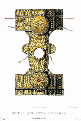 | Keywords: Drevnosti RG v3 ill051 - Zertsalo Alex.Mikh.jpg en Mirror armour ru Зе цало ца я Алексея ихайловича Зе цало ца я Алексея ихайловича сделано в 1670 г по об азцу зе цала ца я ихаила Федо овича с подобной же надписью вок уг ге ба но с азницей в титуле ца ском а пе еднем щитке надпись «Божиею милостию Великий Госуда ь Ца ь и Великий Князь Алексей ихайлович всея Великия и алыя и Белыя России Самоде жец и многих Госуда ств и земель Восточных и Западных и Севе ных отчичь и дедичь аследник Госуда ь и Обладатель» а заднем также выведено «Сделаны сии зе цала повелением Великаго Госуда я Ца я и Великаго Князя Алексея ихайловича всея Великия и алыя и Белыя России Самоде жца п и боя ине и о ужничем п и Богдане атвеевиче Хит ове с това ищи в лето 7178 1670 ма та в 4-й день» Д евности Российского госуда ства http //john-petrov livejournal com/1190678 html Солнцев Фёдо Г иго ьевич < 1853 PD-old Antiquities of Russian country - Volume III Zertsalo Alexis I of Russia's items Files uploaded by Shakko from various sources |