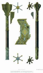 | Keywords: Drevnosti RG v3 ill080.jpg  Шестопе и буздыхан В описи О ужейной палаты в числе шестопе ов «  10  стальной об осьми пе ьях из коих двух недостает; полуяблоко на ве ху и пе ья ук ашены яхонтовыми иск ами; че ен де евянный т убки насечены золотом  5  стальной с осемью гладкими небольшими пе ьями и гладким полуяблоком на ве ху; т убка  езана полосками п ямо и вкось Че ен де евянный» Д евности Российского госуда ства http //john-petrov livejournal com/1190678 html Солнцев Фёдо Г иго ьевич < 1853 PD-old Antiquities of Russian country - Volume III Files uploaded by Shakko from various sources |