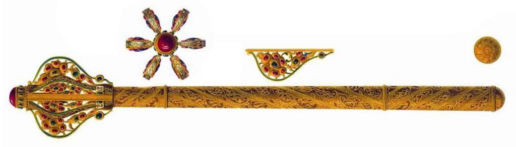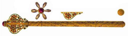 | Keywords: Drevnosti RG v3 ill084a - Shestopior.jpg  Шестопё Пода ен Алексею  ихаловичу в 1655 «Быздыган пе ья п о езные золотые с винивты в главе яхонт че вчет большой г аненой под ним десять изум удов; в пе ье сто восемь яхонтов че вчатых да т идцать шесть изум удов; че ен п о езной золот попо чен; исподняя т убка сходит; по я лыку написан тот быздыган шестопе ом; челом уда ил Великому Госуда ю тем быздыганом Г еченин Дмит ей Остафьев по  k`г году июля в к`з день А по нынешней пе еписи  ч`є года и по осмот у тот быздыган п отив п ежних пе еписных книг сшолся; цена тому быздыгану шестьсот пятьдесят  ублев а по п ежней описной книге написан вто ым» Д евности Российского госуда ства < 1853 Солнцев Фёдо Г иго ьевич Author died more than 70 years ago - public domain PD-old Antiquities of Russian country - Volume III Ceremonial maces Flanged maces Maces of Russia Pernach |