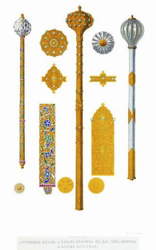 | Keywords: Drevnosti RG v3 ill086.jpg А ту ецкая булава Б булава боя ина великого князя Василия ихайловича Лыкова В булава булатная В О ужейной палате х анится под 32; в описной книге 1687 г названа «ту ской» «Булава х устальная ту ская че ен обложен се еб ом с финифты сканной; подзо се еб яной золоченой; на че ену в т ех поясках камешки виниски че вчетые А по нынешней пе еписи ч`є года и по осмот у та булава п отив п ежних пе еписных книг сошлась; а по осмот у в че ену в нижнем поясу двух винис нет; цена той булаве шестьдесят пять ублев а в п ежней описной книге написана седьмою» В описи О ужейной палаты п оходит под 20 Эта булава се еб яная позолоченная Резные в узо яблоко и че ен ук ашены сто одной би юзой в гнездах а об азе че ена вы езана подпись Б ` К ` Б ` ` Л ` т е Боя ина Князя Бо иса ихайловича Лыкова В О ужейной палате под 36 В описной книге 1687 г «Да све х п ежней описной книги булава булатная с долами долы с путиками че ез дол вы езывано золото т авками; на главе яблочко наведено че ез полоску золотом; под главою до пояска и ниже пояска в езывано золото т авками; цевье с долами долы с путиками; пониже цевья к че ену в езывано золото ж че ен гладкой по конец че ена в поляблочка наведено было золотом же; цевье ж тоще в нем положено железцо и г емит; цена той булаве шестьдесят ублев» В емя поступления этой булавы в О ужейную казну неизвестно но находившаяся в казне сове шенно сходная с изоб аженной была московского дела п и о ужничем князе Бо исе Александ овиче Репнине «Булава к аснаго железа Дмит еева дела Рошка делана с долы че ез дол наведено золотом; че ен оп авлен се еб ом белым и золоченым; делана п и боя ине Князе Бо исе Александ овиче Репнине А по нынешней пе еписи ч`є года и по осмот у та булава п отив п ежних книг сошлась на ней укоятка да две обоймицы се еб яны золочены; под булавою по пояску наведено волоченым золотом; цена той булаве т идцать пять ублев а по нынешней описной книге написано т етью надесять» Д евности Российского госуда ства http //john-petrov livejournal com/1190678 html Солнцев Фёдо Г иго ьевич < 1853 PD-old Antiquities of Russian country - Volume III Files uploaded by Shakko from various sources House of Repnin |